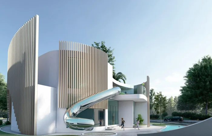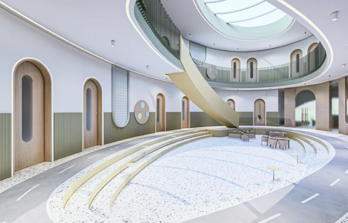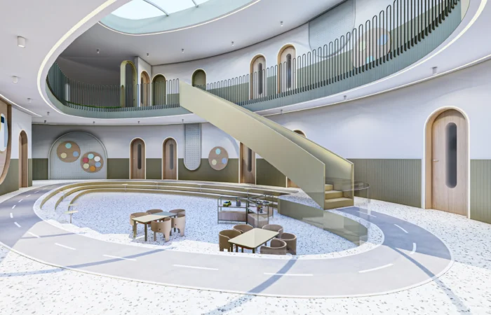 This preschool is a marvel of fluid, futuristic design. Taking inspiration from the organic form of a water drop, the architecture creates a playful, inviting environment for children. The make-believe road that encircles the play area under the skylight leads to the staircase and then to the beautifully crafted railings of the upper floors.